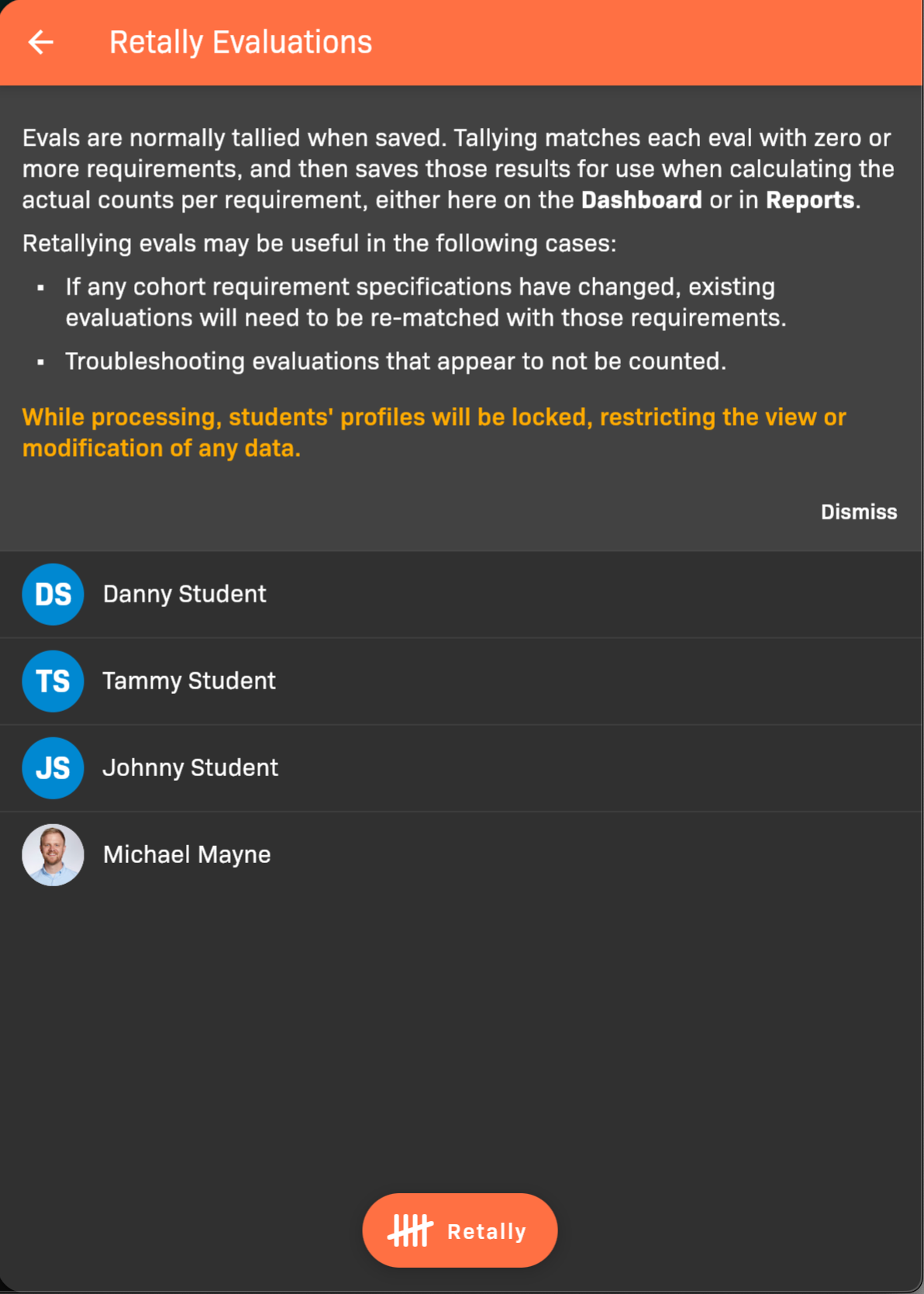 Section titled “Retally Evaluations for a cohort”If any cohort requirement specifications have changed, and students have already entered data, existing evaluations will need to be re-matched with those requirements.
