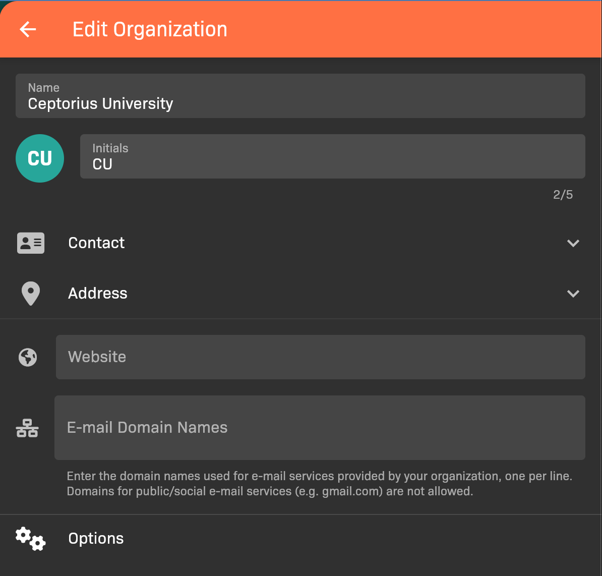Section titled “Organization details”The Edit Organization pane allows you to configure organization details such as organization name, details, contact person, address, website, and email domain names.