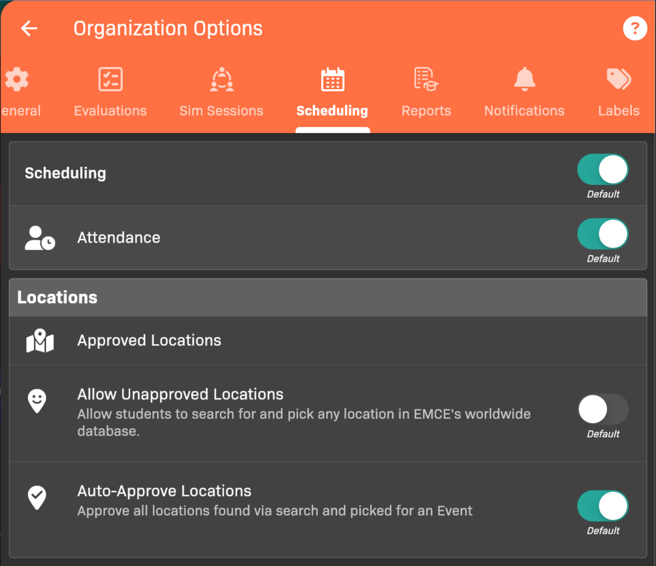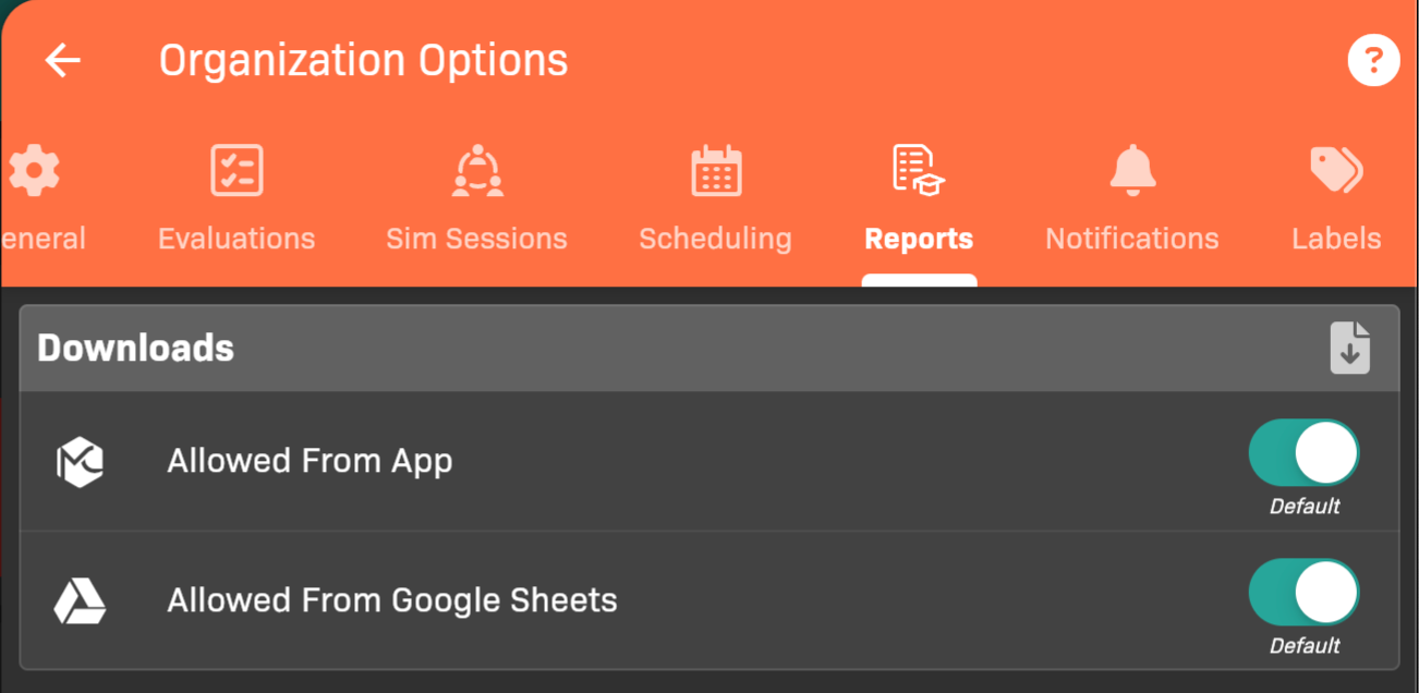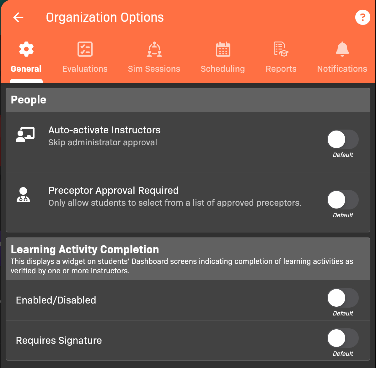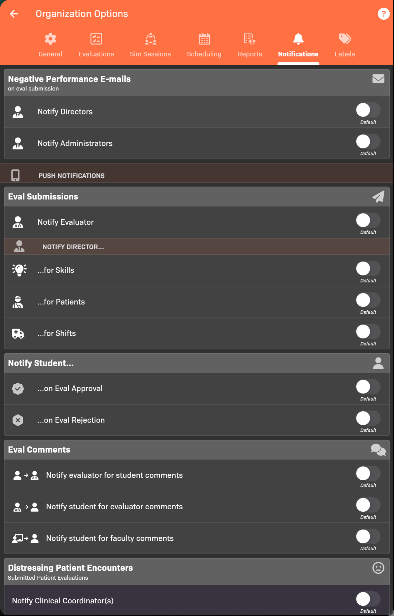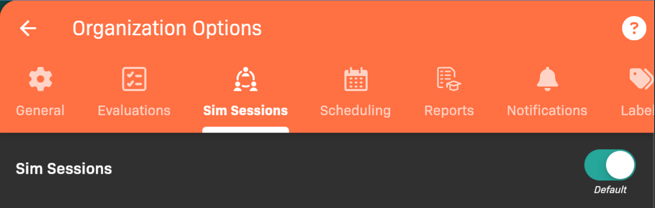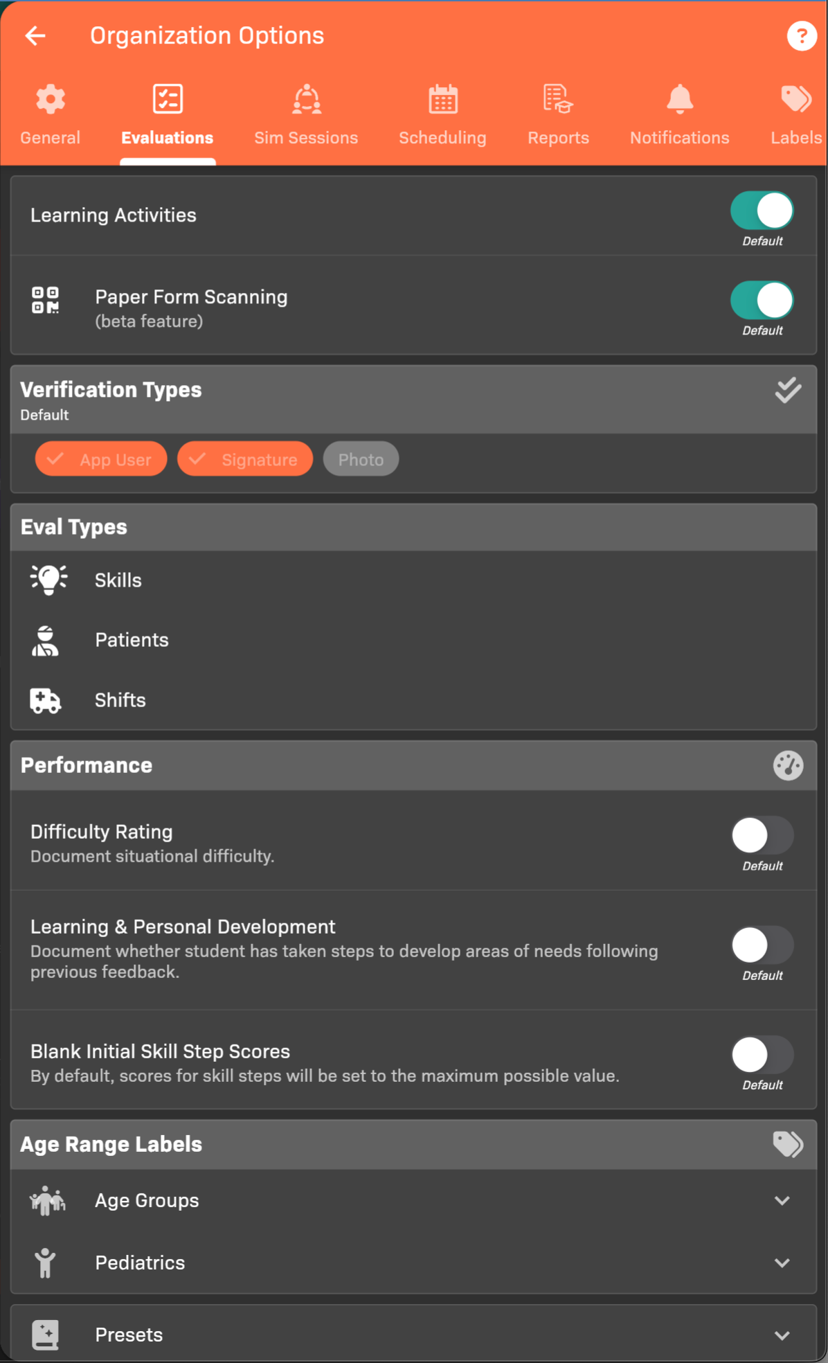 Section titled “Organization options”The organization options provide customizable policy settings for app behavior, including general settings, evaluations, sim sessions, scheduling, reports, notifications, and labels.