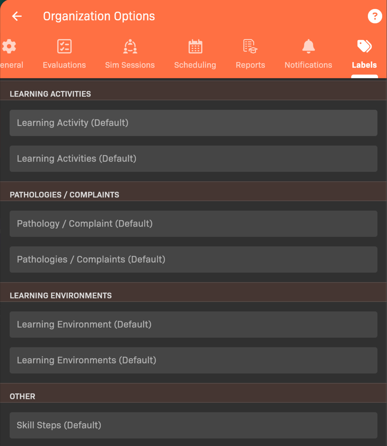 Section titled “Labels tab”The Labels tab allows you to rename Learning Activities, Pathologies, Learning Environments, and Skill Steps in the app to match the terminology your organization uses.