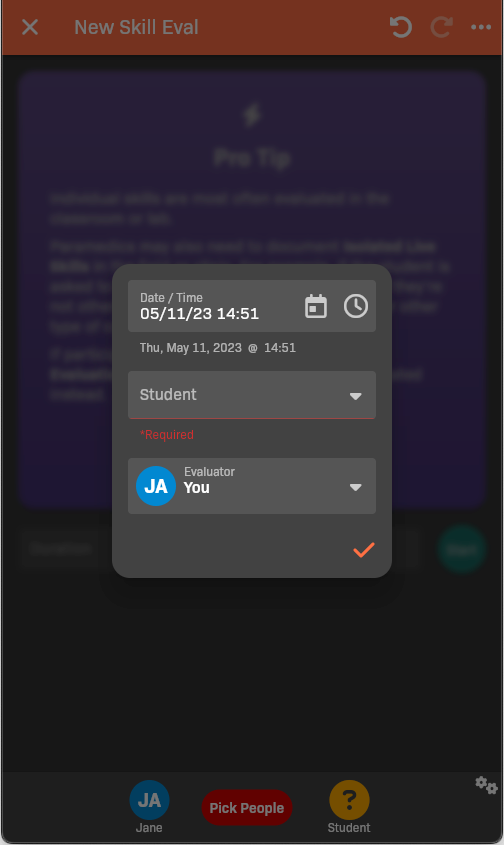 Section titled “Step 2: Fill out the evaluation details”Complete the form to record the student’s performance.