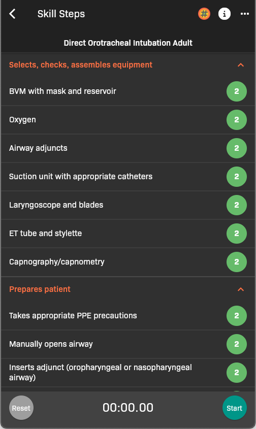 Each step can be given an individual rating. Some skills use simple successful/unsuccessful scoring, while others use a 3-point scale. Tap the # button at the top of the screen for details about the rubric.