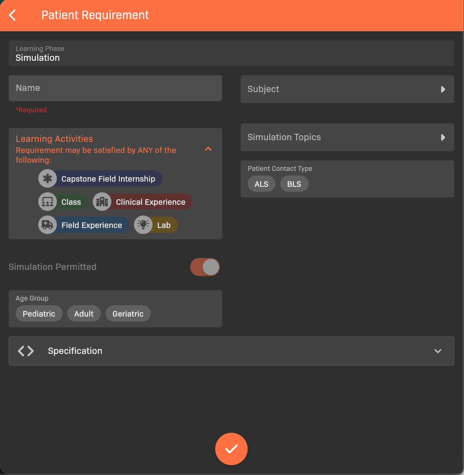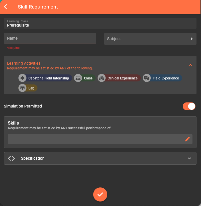 - Enable or disable Simulation Permitted as needed; if enabled, the skill does not have to be performed on a real patient. This cannot be disabled for the requirements in the Simulation learning phase.