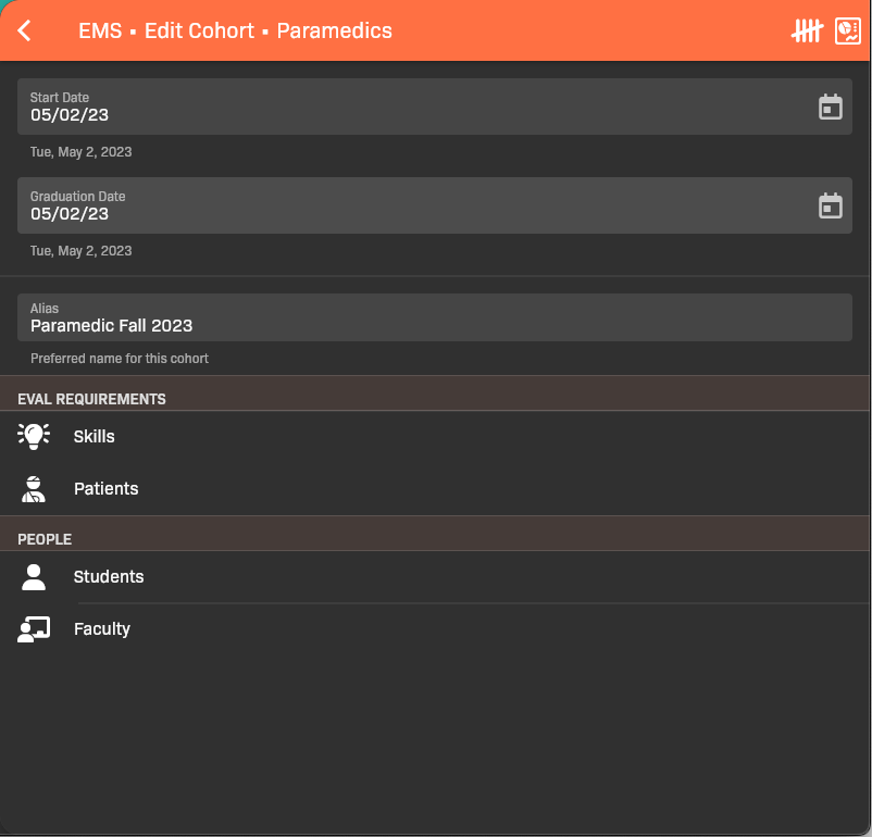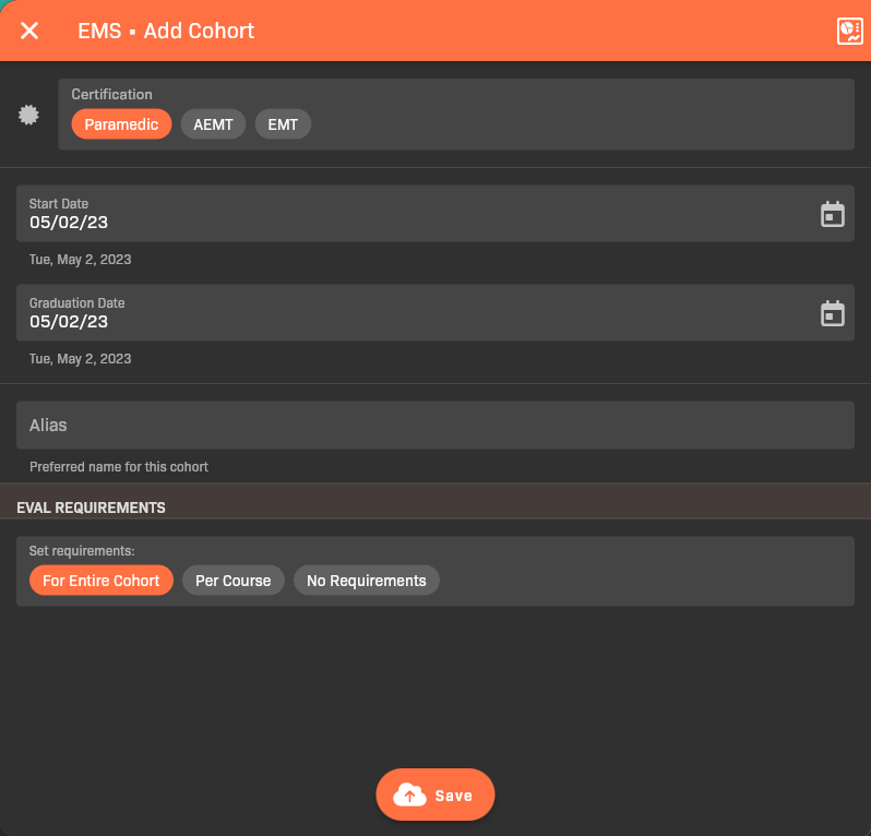 Section titled “Step 1: Create the cohort”You will eventually make a cohort for each “graduating glass” in each particular program. For example, you might have an EMT – Fall 2023_ cohort for EMT students that will complete their program by fall 2023.