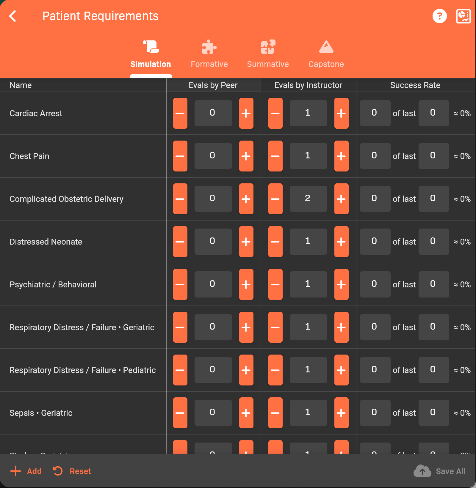 Section titled “Reset all patient requirements to the default”If you want to reset the patient requirements to the default minimum evaluation requirements, click Reset in the bottom-left corner.