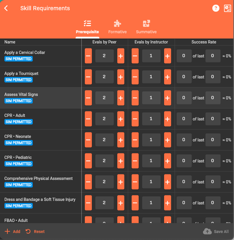 Section titled “Change the number of evals needed for a skill requirement”You can increase or decrease the number of of peer and instructor evals needed for a particular skill by: