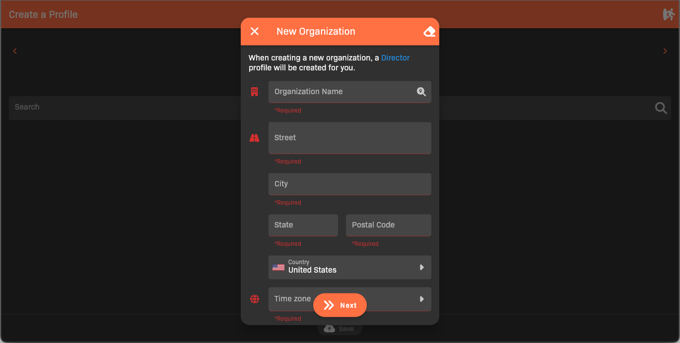 If you signed up as a director, we’ll do our best to automatically match you with your organization based on your email address. If we couldn’t match you automatically, you’ll have to search for your organization.