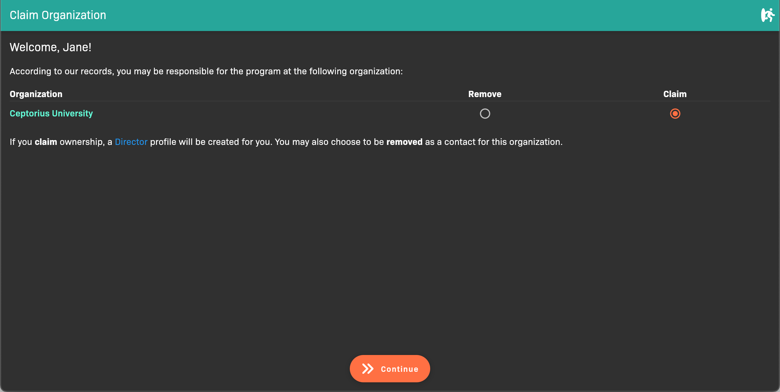 - If the displayed organization is correct, make sure Claim is selected, then click Continue. You’re done! Move on to Add Your First Cohort.