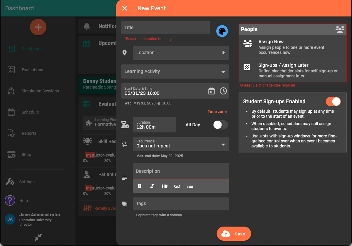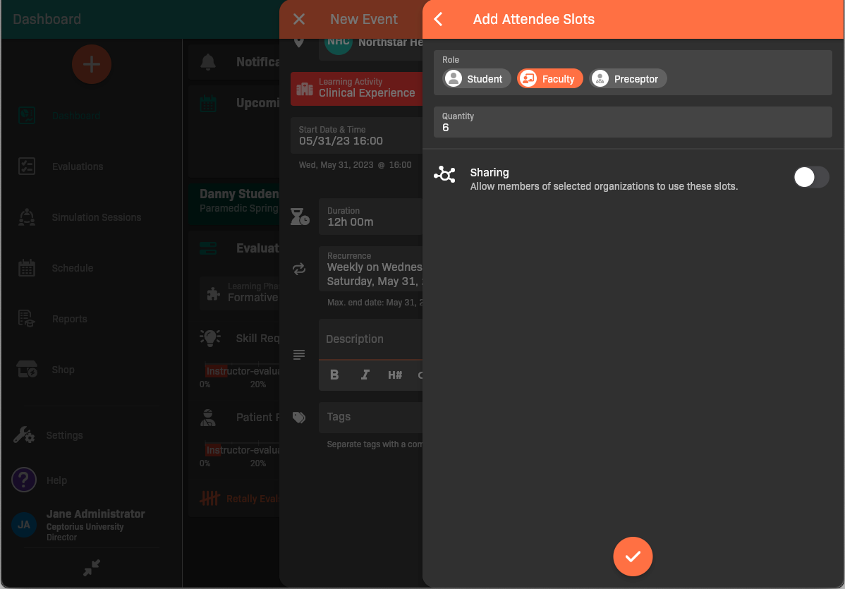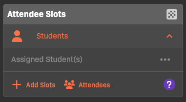 Section titled “Step 4: Add placeholder slots”Add placeholder slots if you’d like to allow people to sign up for the event later. Any number of attendee slots can be configured for students, faculty, or preceptors. Once an event is created, slots allow people to sign up according to each slot’s criteria.