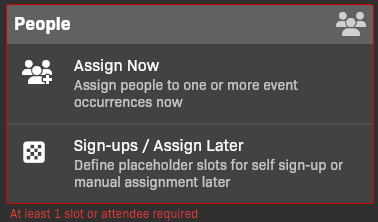 Section titled “Step 3: Assign people to the event”Perform these steps if you’d like to assign people to the event now. If not, skip to #step-4-add-placeholder-slots.