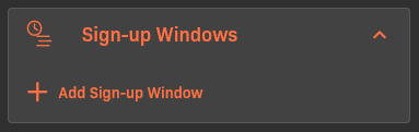 Section titled “Step 5: Add Sign-up Windows”Add Sign-up Windows to control when people can take slots on the event. If you do not add windows, anyone that matches the set slot criteria can sign up at any time.