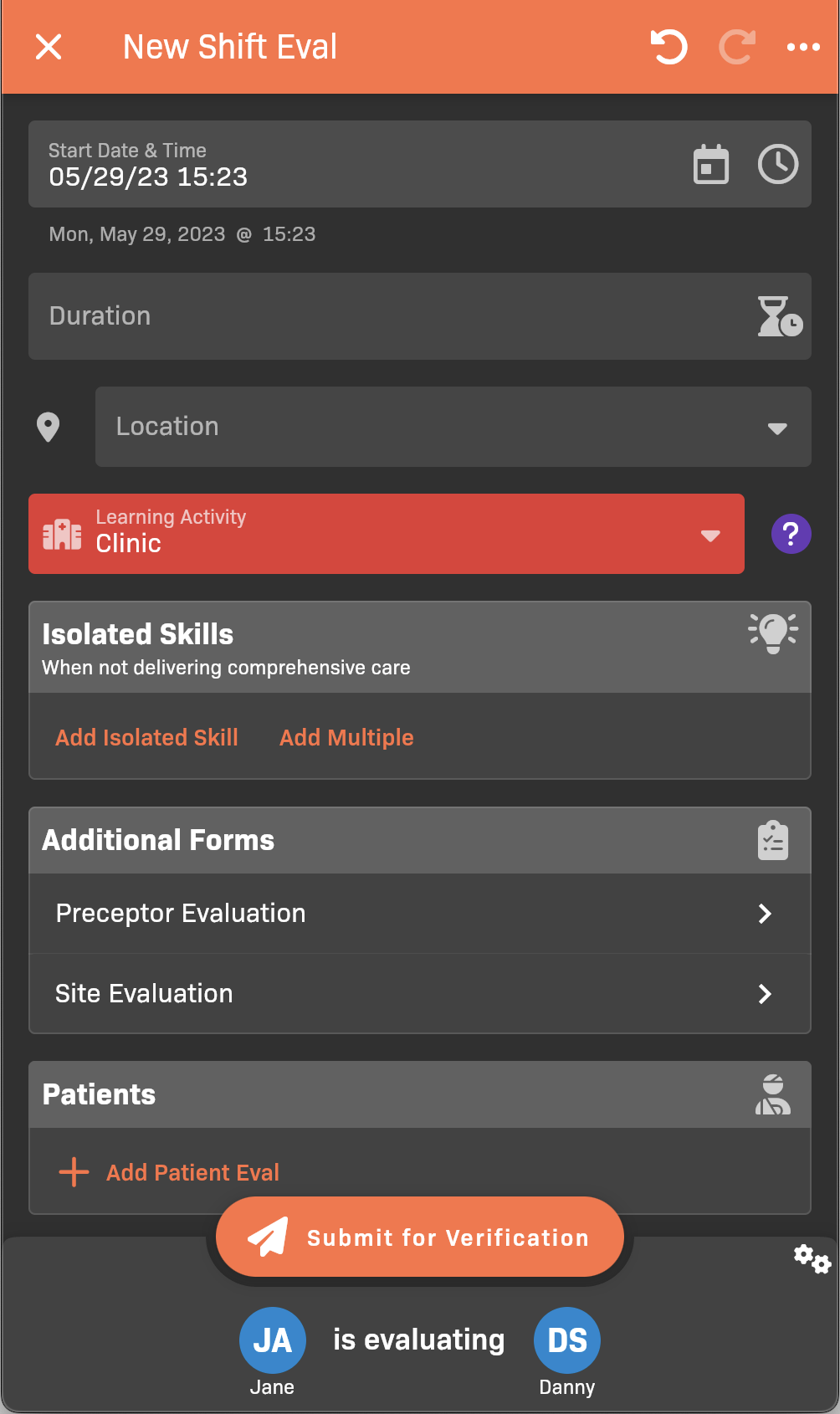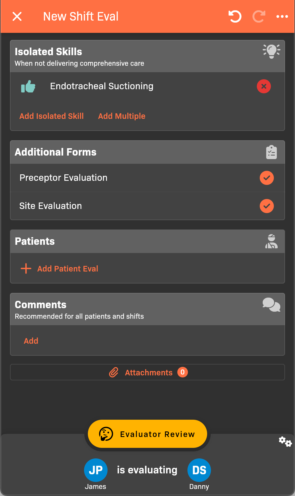 - Hand your device to the preceptor so that they can complete the review. See performing-evaluator-review-for-a-shift-evaluation for more information.