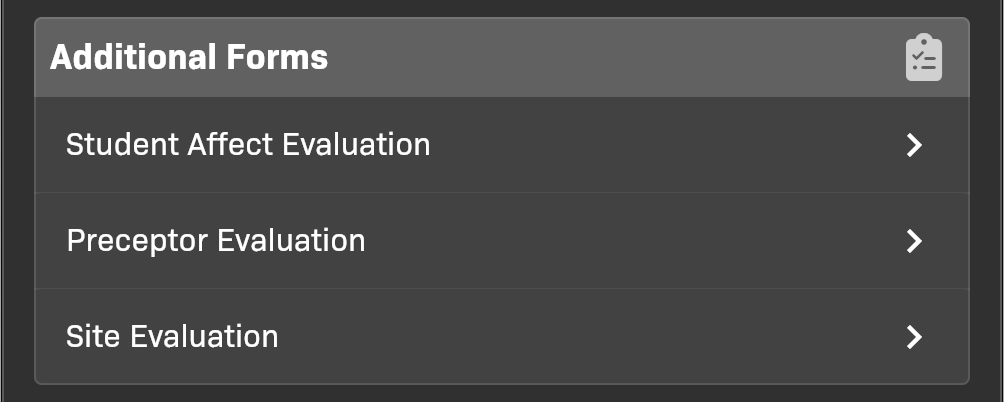 In Additional Forms, complete the Student Affect Evaluation, Preceptor Evaluation, and Site Evaluation.