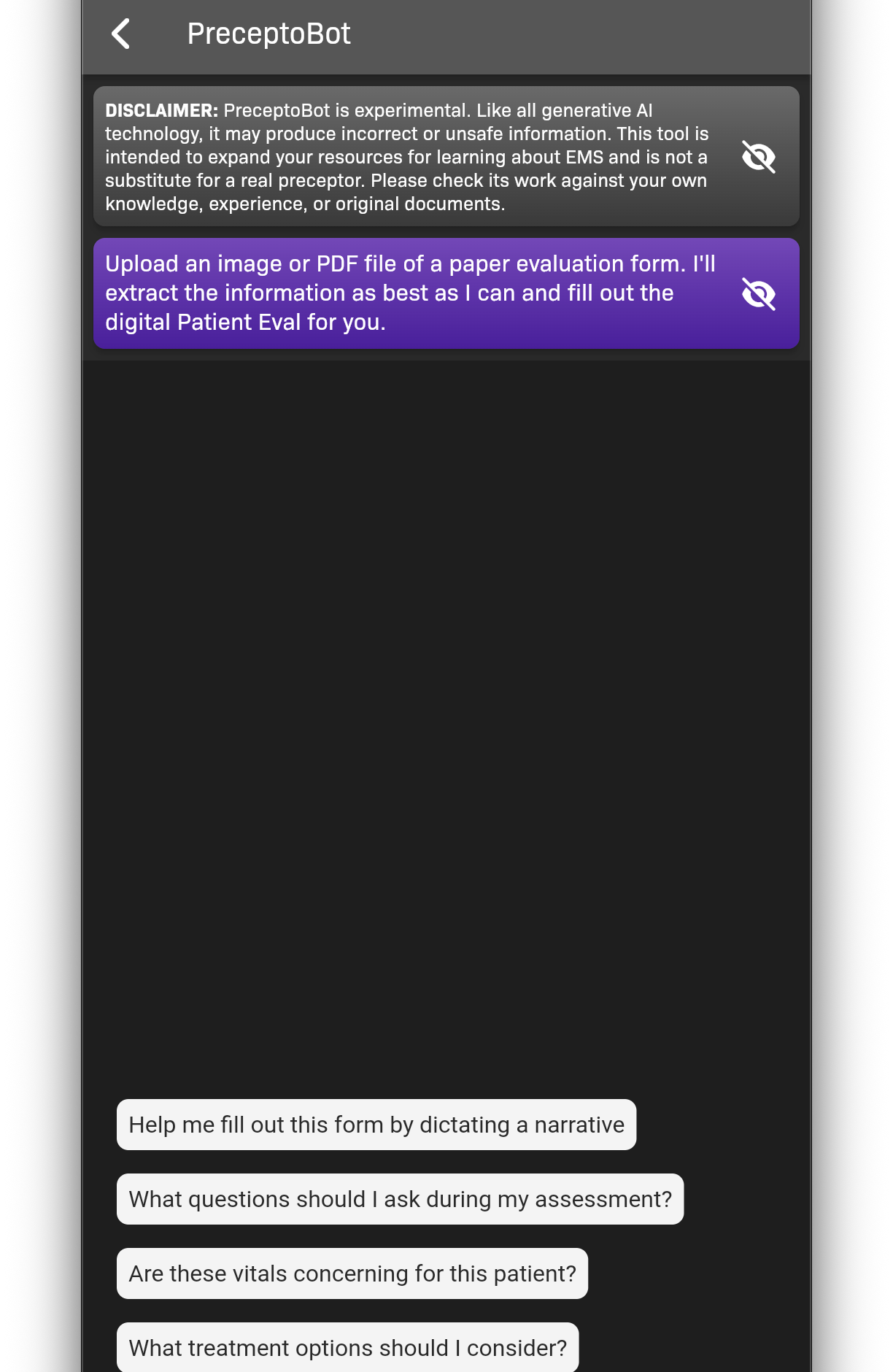 PreceptoBot. - Provide information by dictating a narrative, typing it, or uploading a photo or PDF of a paper form.