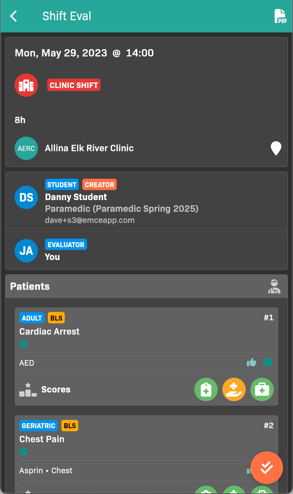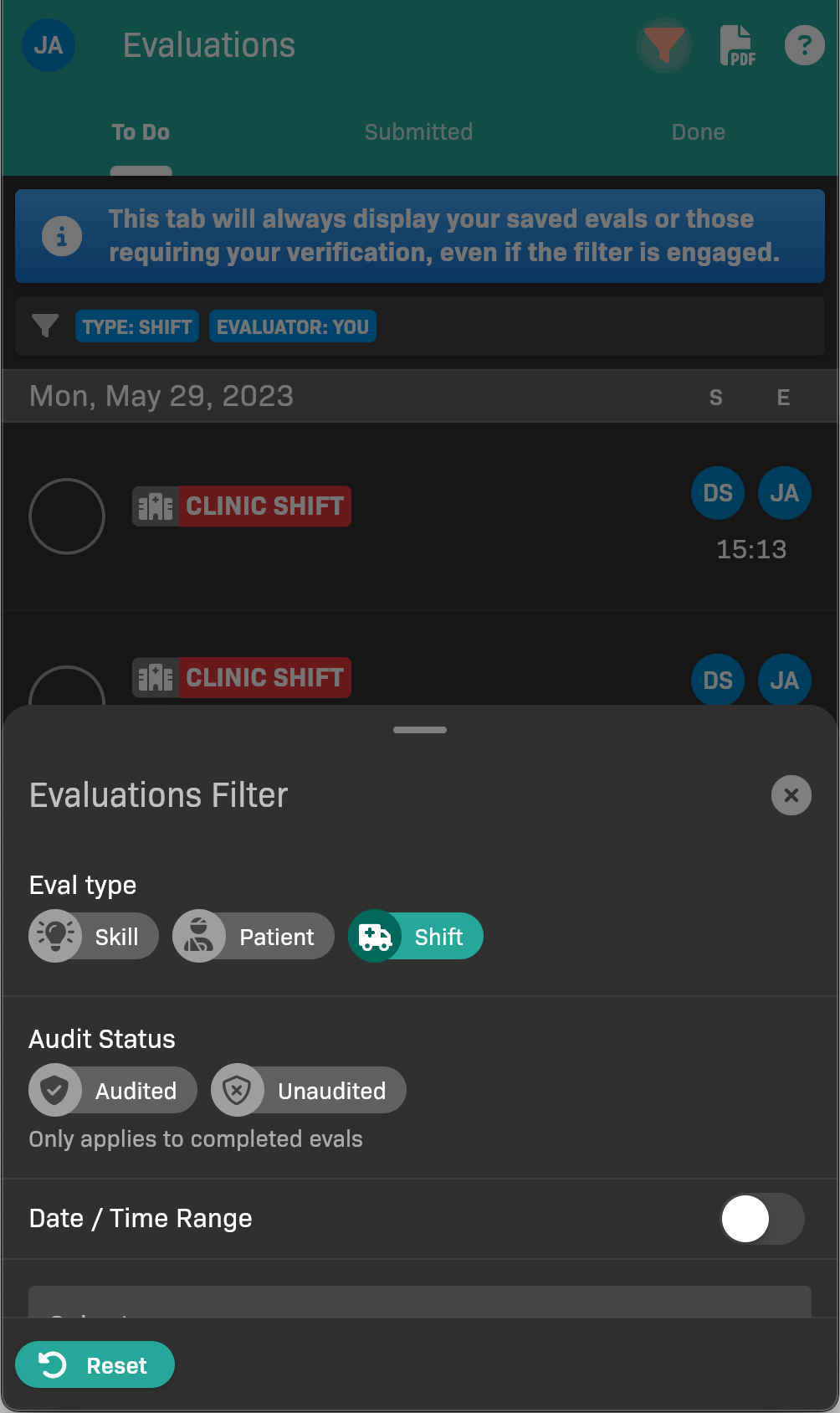 - Select Shift under Eval type to see only simulated patient evaluations