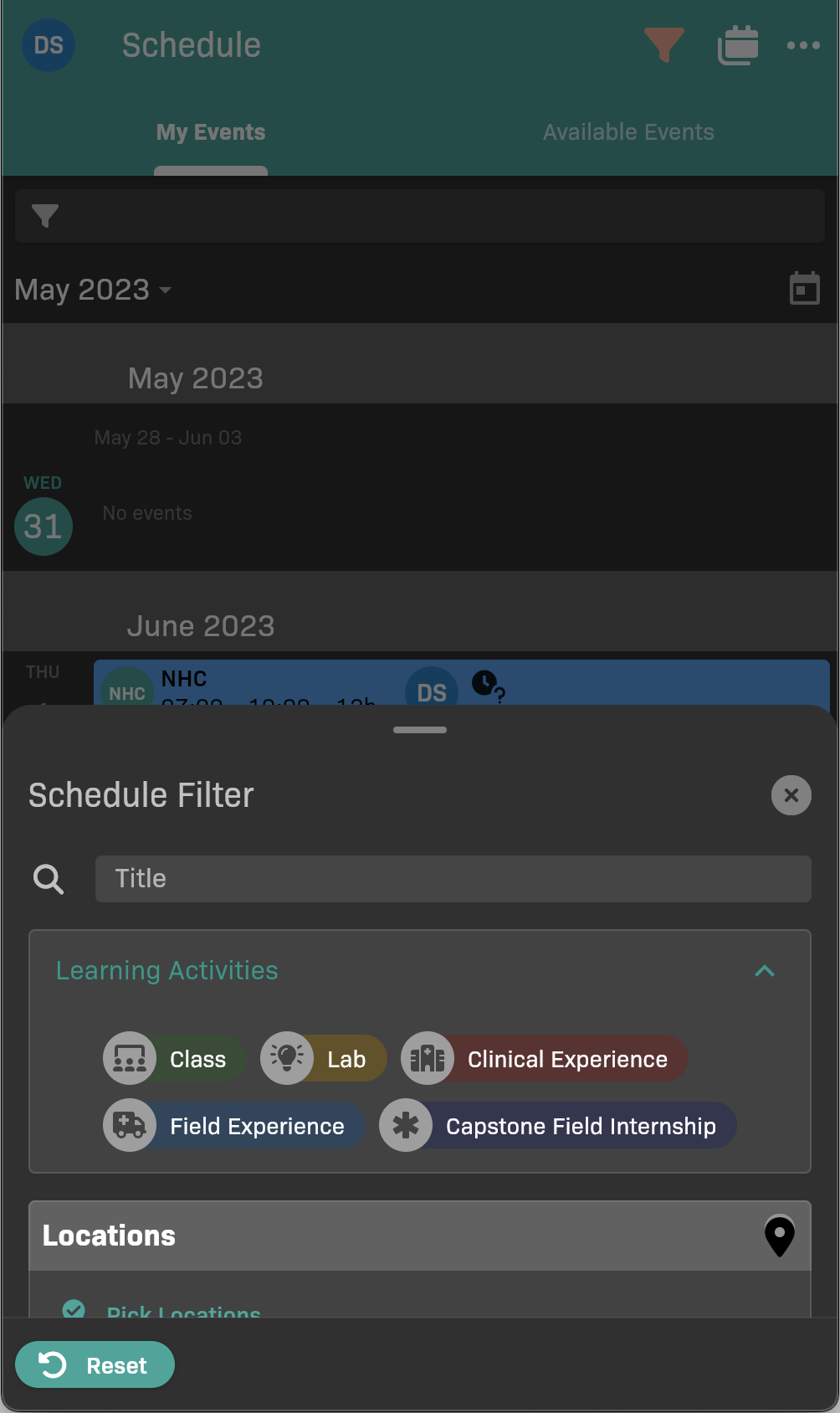 Section titled “Filtering the schedule”Tap to view schedule filter options.